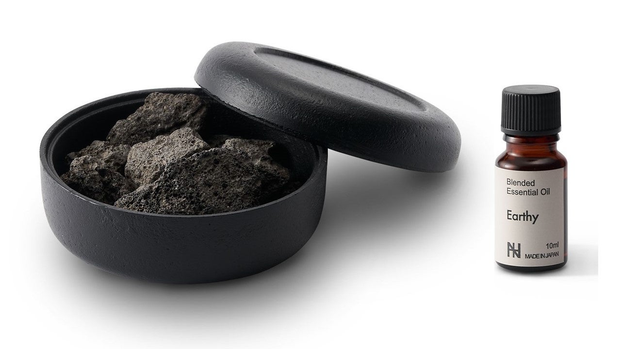 銅器産業やものづくりの街、富山県高岡市発、ミニマルなデザインのアクセサリーやテーブルウェアなどのライフスタイルグッズを展開している「ナガエプリュス」より、今号では和の趣を感じられる鉄鋳物の器と溶岩石を合わせたアロマディフューザーとおすすめのエッセンシャルオイル1本をセットにしてお届けします。溶岩石に数滴のオイルを垂らすことでふわりとアロマの香りが優しく広がり、デスク回りやベッドサイドが癒しの空間へ変わります。蓋は裏返して器の下台としてもお使いいただけます。