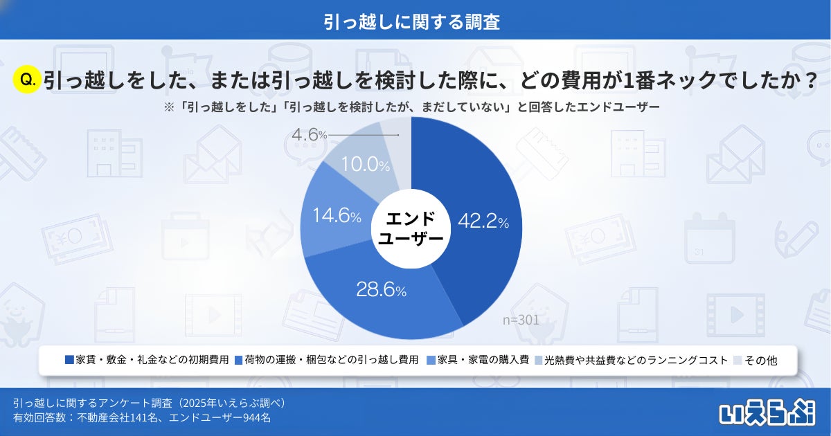 不動産業界特化のDX支援サービスを展開する、株式会社いえらぶGROUP(本社:東京都新宿区、代表取締役:岩名泰介、以下「いえらぶGROUP」)は、不動産会社・エンドユーザーに対して「引っ越しに関するアンケート調査」を実施しました。不動産会社141名、エンドユーザー944名、有効回答1,085件の調査結果を発表します。