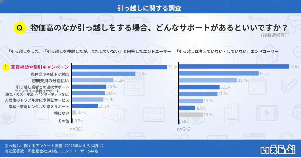 「引っ越しをした」「引っ越しを検討したが、まだしていない」と回答したエンドユーザーに「物価高のなかで引っ越しをする場合、どのようなサポートやサービスがあるとよいと思いますか?」と質問したところ、「家賃補助や割引キャンペーン」が70.8%と最も多く、次いで「条件交渉や値下げ対応」(47.5%)、「初期費用の分割払い」(31.2%)という結果となりました。