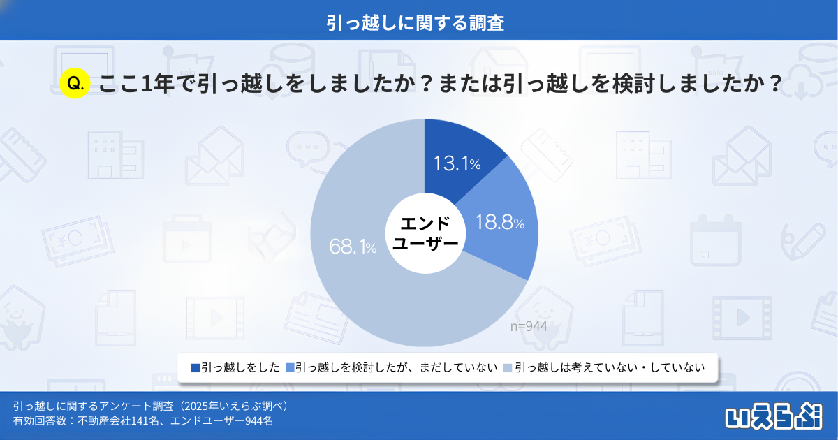 エンドユーザーに「ここ1年で引っ越しをしましたか?または引っ越しを検討しましたか?」という質問をしたところ、「引っ越しをした」:13.1%、「引っ越しを検討したが、まだしていない」:18.8%、「引っ越しは考えていない・していない」:68.1%という結果となりました。