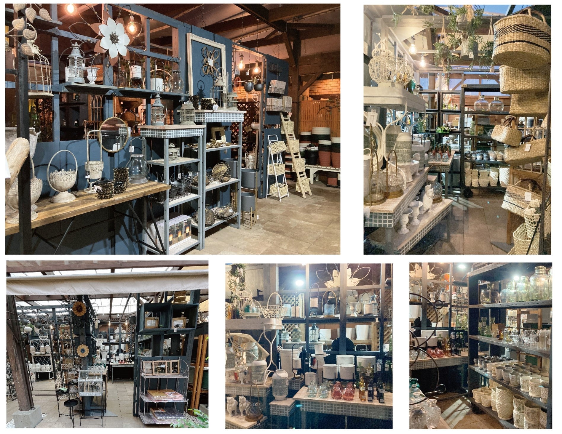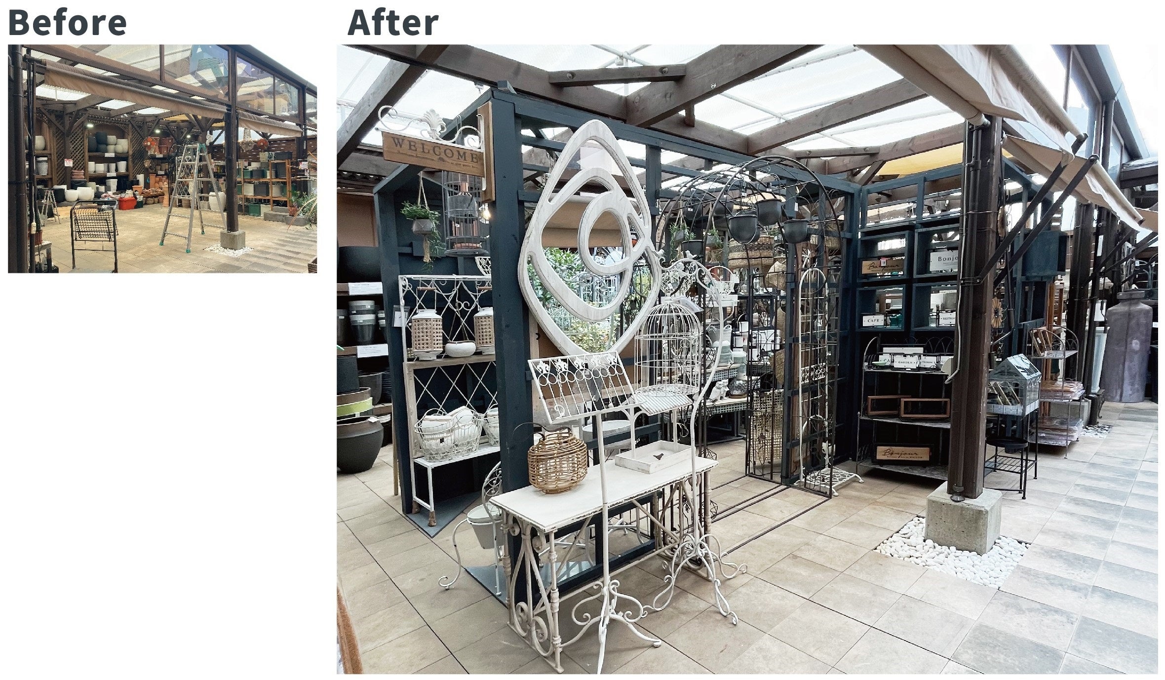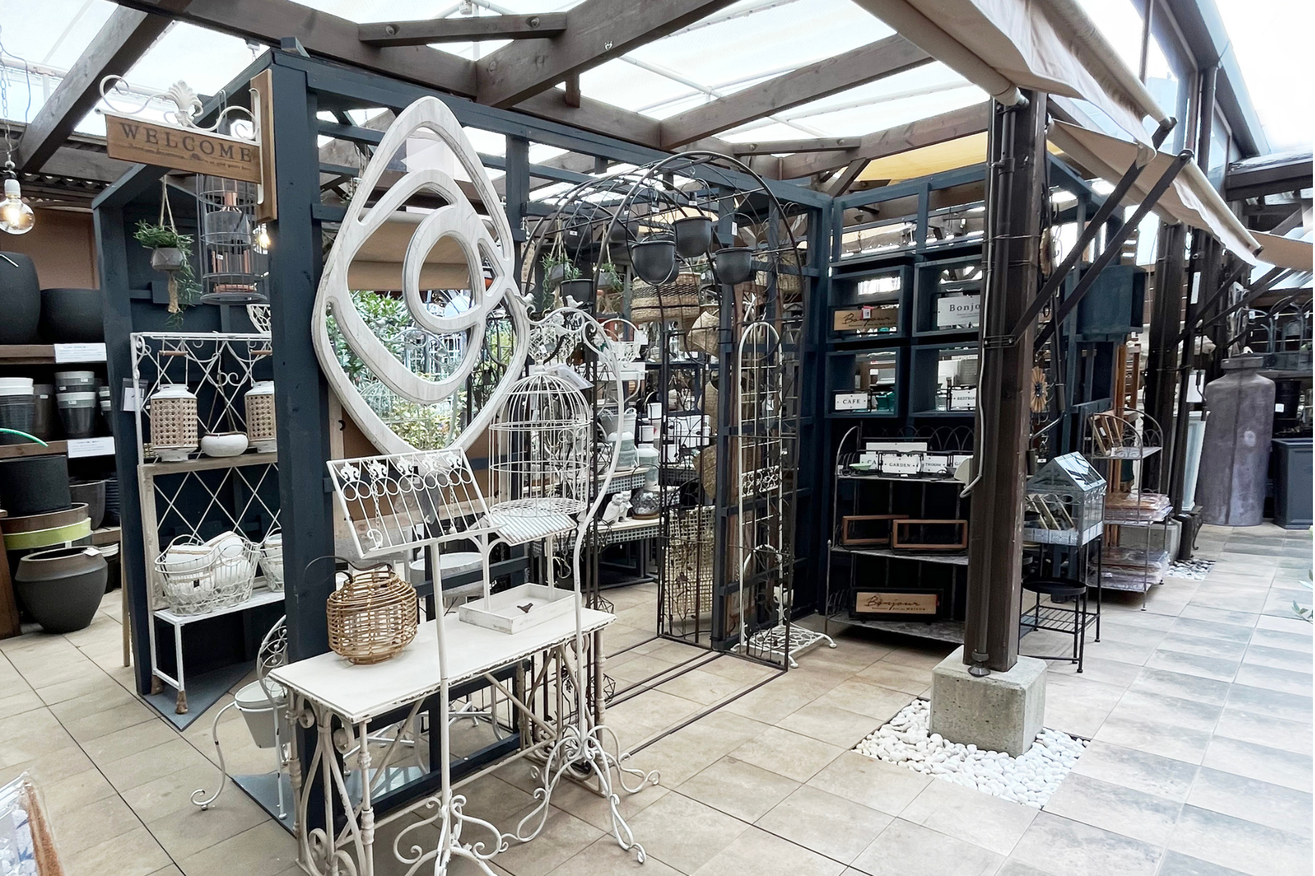 2m × 3mのやぐらを2台設置し、半屋外には大型のガーデン用品や鉢物が並びます。ブルーグレーのやぐらには、植物に合わせた器や雑貨が配置され、ホワイトアイアンやナチュラル素材、ガラスベースが商品を引き立てます。入口を複数設けることで、お客様は中に入りたくなり、楽しみながらお気に入りを探すことができます。