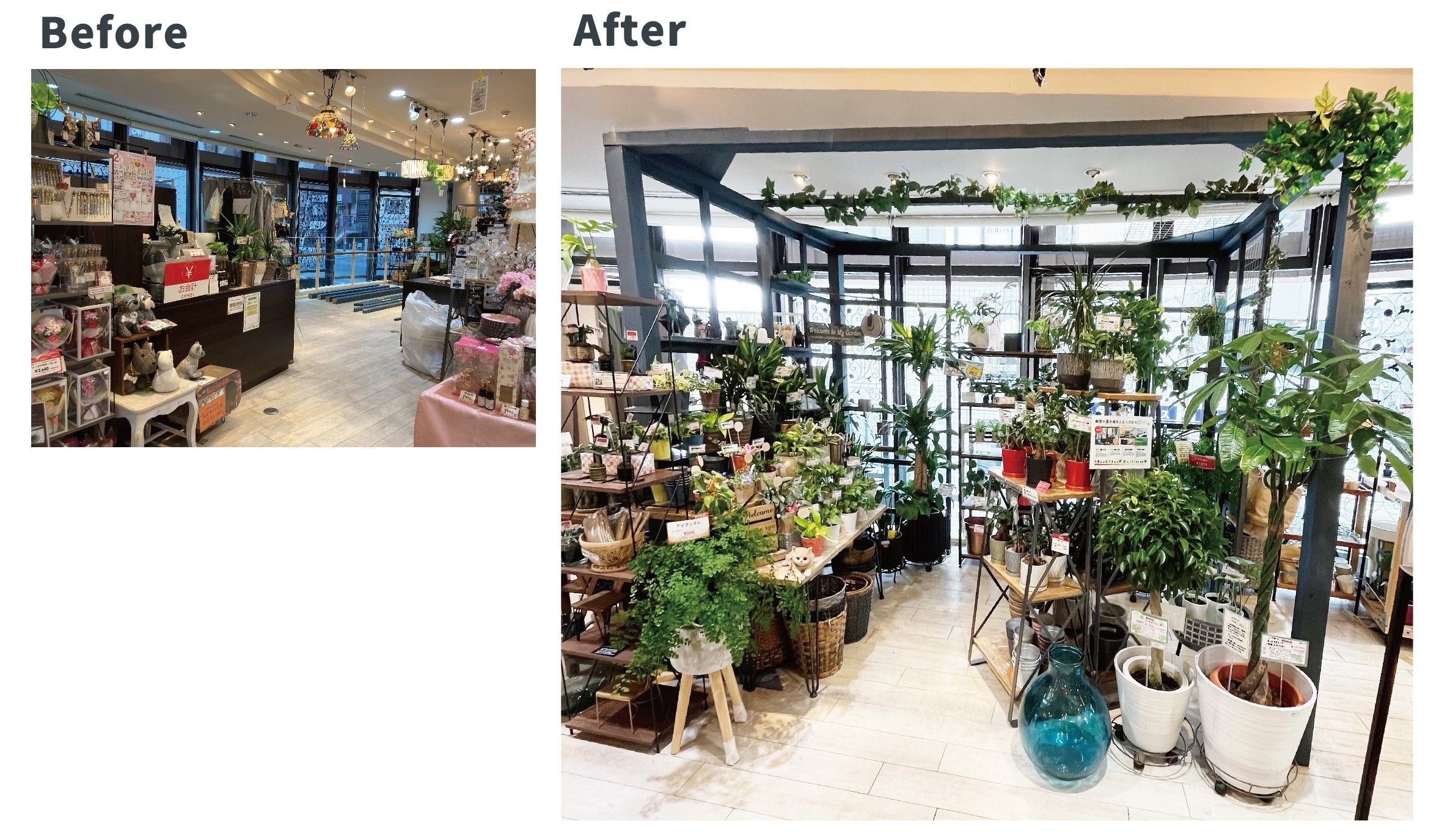 2m × 3mのスペースに1台のやぐらを設置し、店内奥のレジ横には、ガーデン雑貨や観葉植物、鉢物などがたくさん並ぶ「グリーンとインテリア」売り場が誕生しました。やぐらのサイズは天井の高さに合わせて調整し、圧迫感を感じさせず、動線を考慮して側面に格子壁が配置しました。
