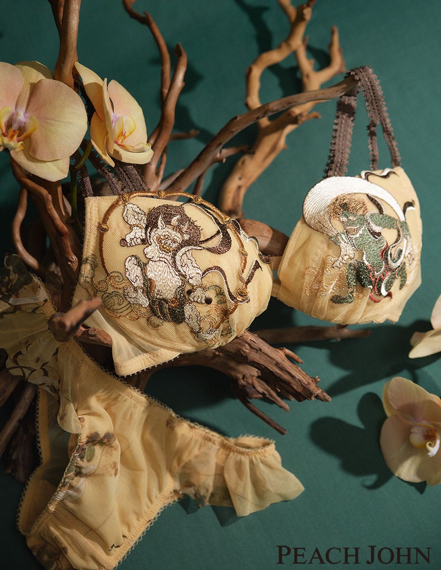 俵屋宗達は江戸時代初期に活躍し、琳派の祖ともいわれる大画家。『風神雷神図屏風』は国宝に指定されている代表作。左右のカップは、金屏風をイメージしたゴールドカラーのチュール地に、風神と雷神を刺しゅうしたレースでカバー。ネックラインにはモチーフが飛び出す大胆なデザイン。ユーモラスで人間味のある表情も巧みに再現しました。