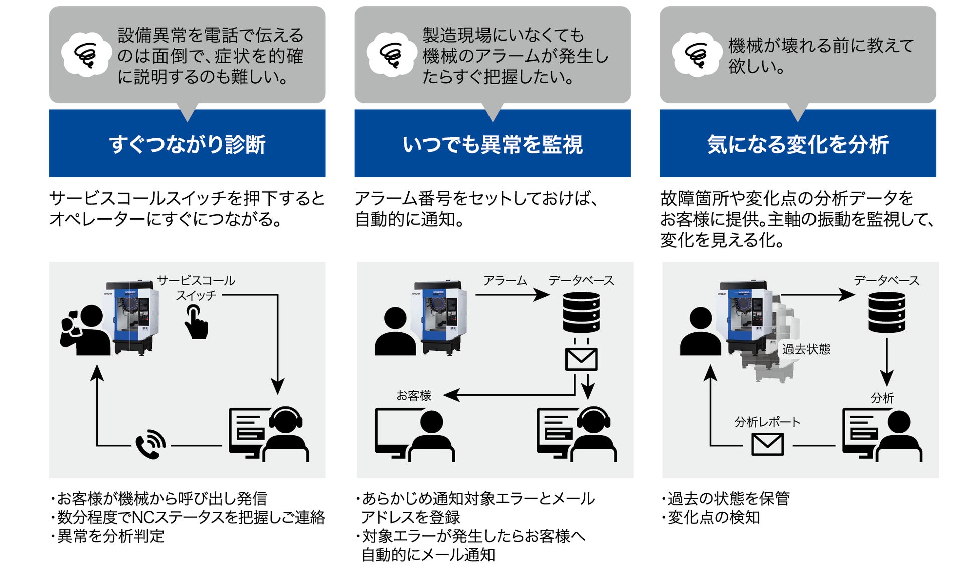 遠隔サポートキットは、制御盤内に「保守装置」、「アンテナ」、機械操作パネルに「サービスコールスイッチ」を設置。設置直後に接続でき、サービスを開始できる。また、追加オプションで、主軸の振動を監視する「主軸センサ」も用意されている。