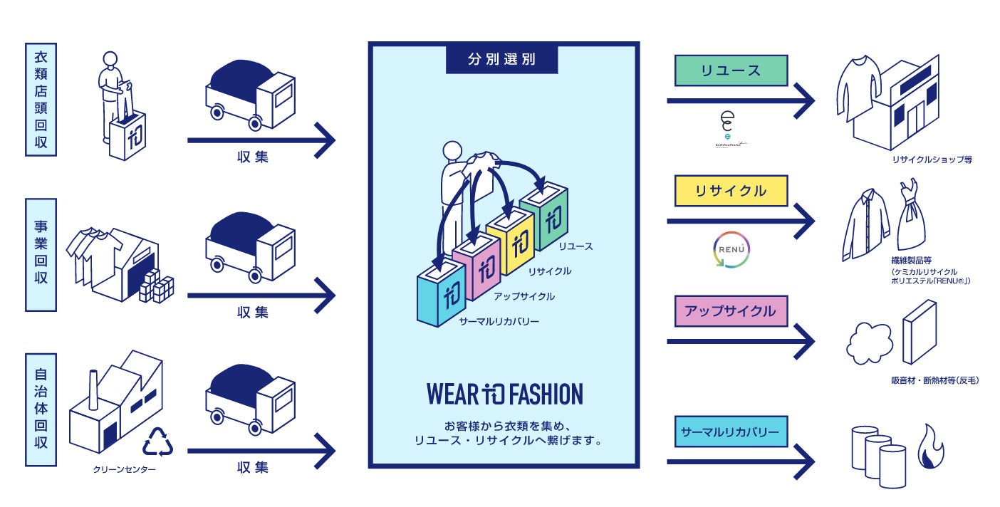 『Wear to Fashion』( http://renu-project.com/wear-to-fashion/ )は、お客様から不要な衣類を集め、リユースやリサイクルへ繋げる取り組みです。「捨てない」選択肢の1つとして、本活動に衣類を提供し、企業が責任を持って再利用や再資源化を図ります。