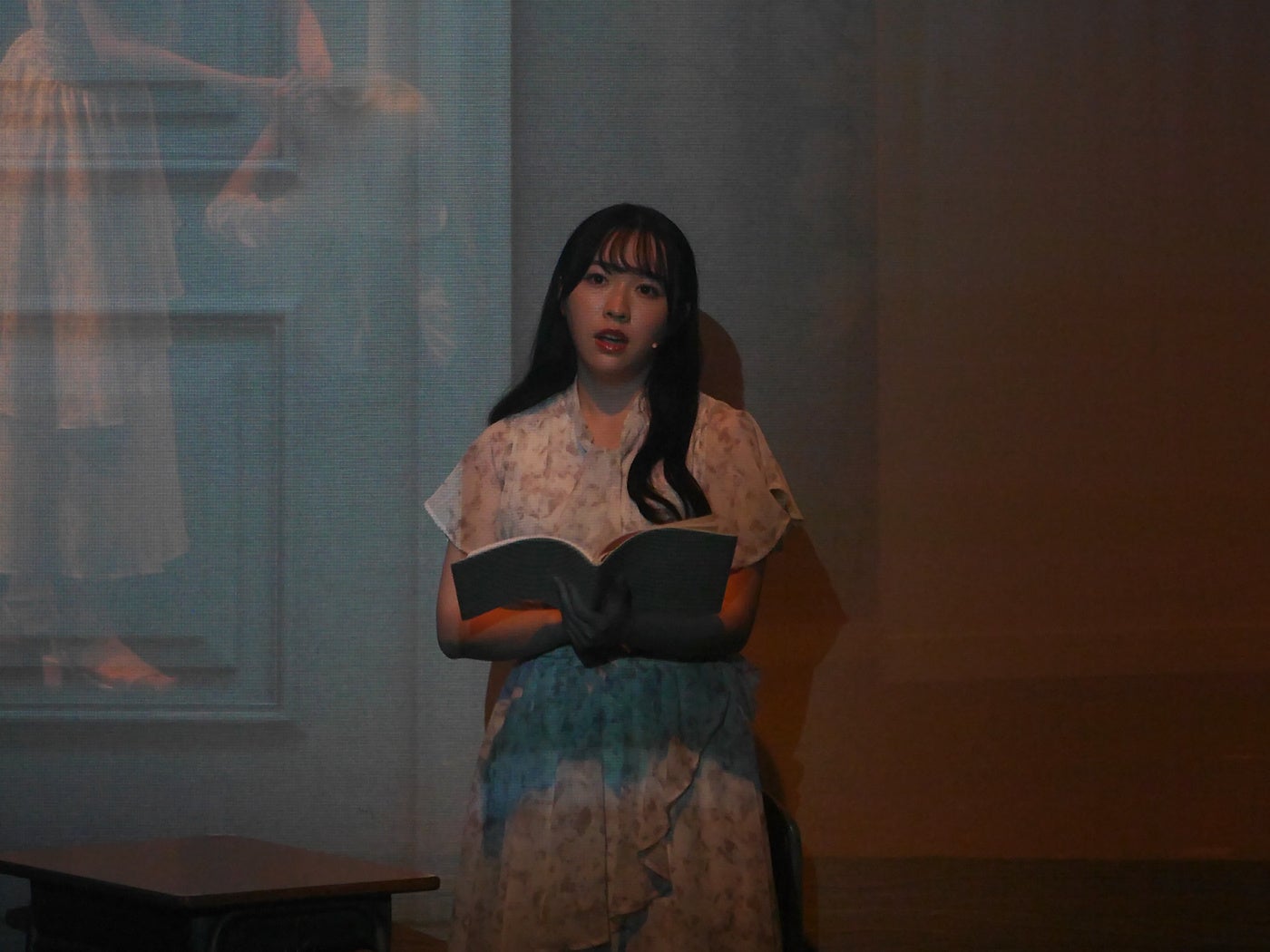 紗幕にはシーンに合わせてさまざまな映像やキャラクターたちの心情を表したかのような映像が投影され、物語が展開。また、ホラー作品ならではの演出もあり、没入感が高い朗読劇に。