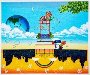 過去は変えられないけど、どの時代でも空はつながっている。いま世界でいろんなことが起きているけど、未来はその空を見て美しいと感じてもらいたいと思って描きました。タイトルの「ふるさと」は、美しかった町、村、国を思い出して、「故郷」を振り返る、そんな未来をイメージしてつけました。