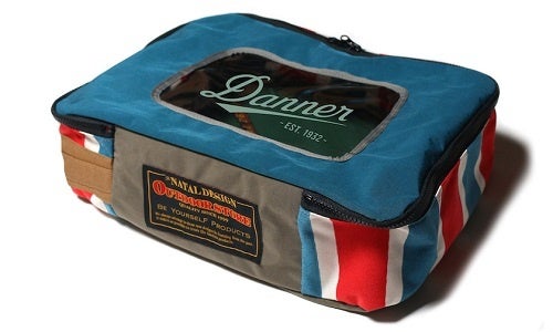 ネイタルデザインのオリジナルレトロストライプとダナーをイメージしたカラーリングの配色が印象的なスペシャルケース。大容量のサイズによってアウトドアギアやシューズケースとしても役立ち、トップのクリア部分にはダナーのロゴをプリント。