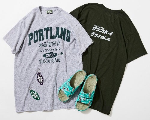 “2022年夏、楽しかったポーランドの思い出をサウナガールに伝えたい・・・”がテーマとなったカレッジ風のプリントTと、同デザインを落とし込んだモーテルキーホルダー。ロッカーキーの総柄がインパクト抜群のコラボ仕様【MIZUGUMO SLIDE】を本企画で再販売。