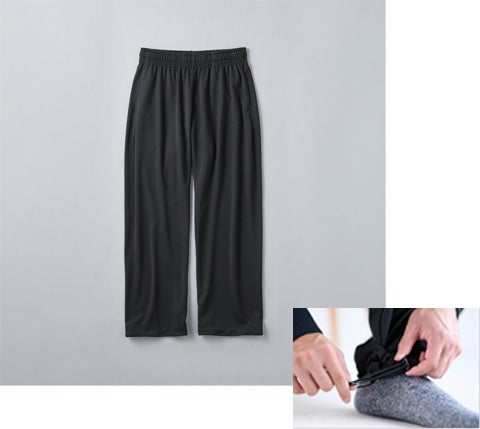 太ももから足首まで、脚全体の可動域を考慮したゆったり設計。膝を曲げたり、脚を組んだりする動作もラクラク。