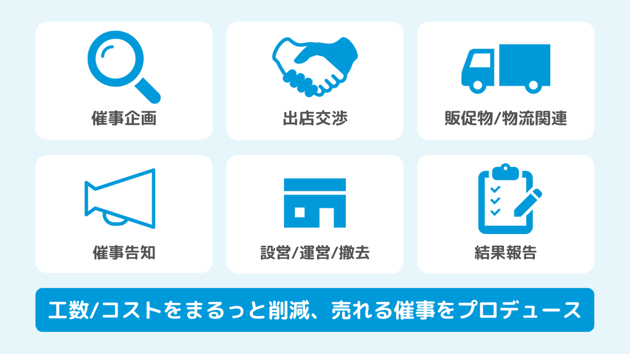 60余年の歴史で培った催事ノウハウを基に、お客様に喜んでいただける売れる催事を全国各地で企画してまいります。催事開催をご検討されているメーカー様や、今話題の商品や人気商品などをお探しの商業施設様は是非お声掛けください。