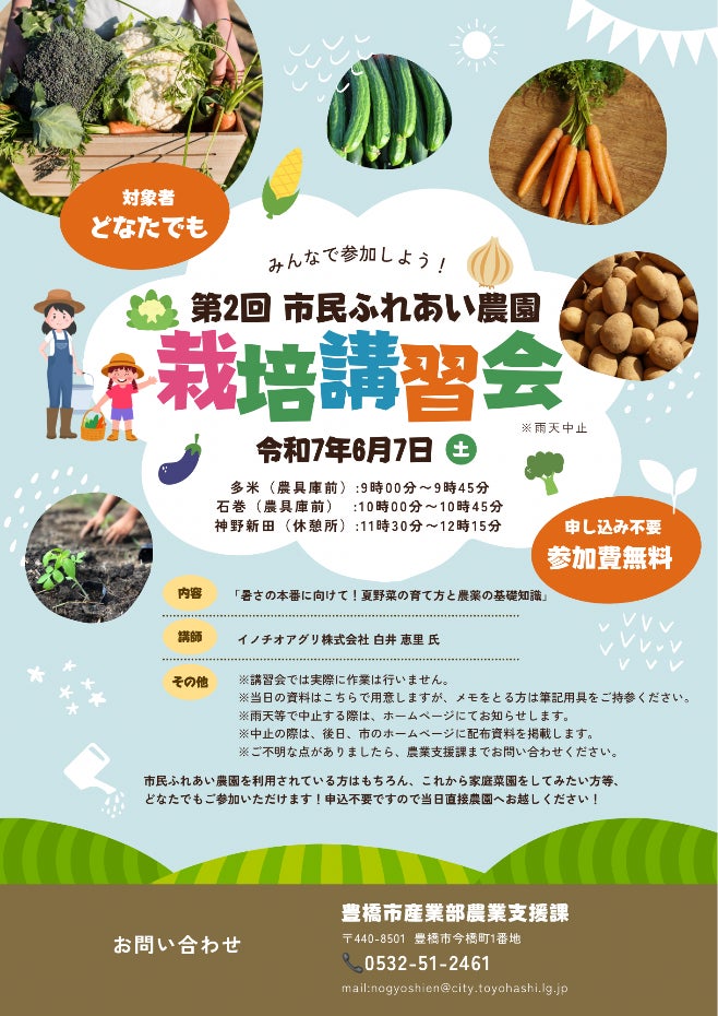 家庭菜園を始めたい人、野菜づくりに興味がある人にぴったりの栽培講習会が2025年6月7日(土)、愛知県豊橋市内の3カ所で開かれます。これから迎える夏本番へ向けて、気をつけたい栽培のポイントや農薬の基礎知識などを、イノチオアグリ株式会社の白井恵里さんが初心者にも分かりやすくレクチャーします。参加無料で申し込みも不要です。
