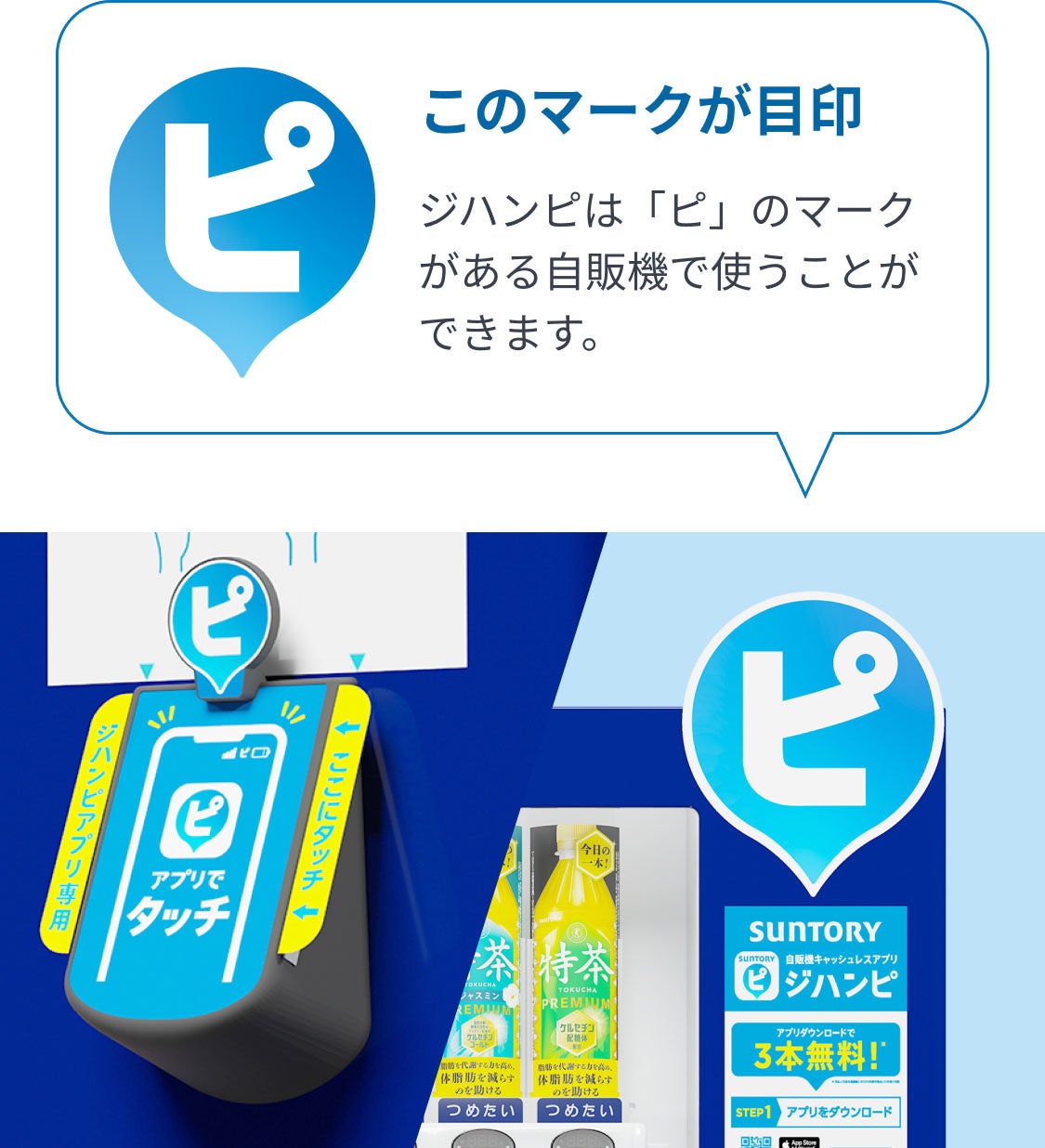 「ジハンピ」とはアプリを起動して、ピッとタッチするだけで買える自販機キャッシュレスアプリです。
