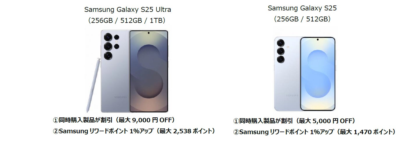 「Samsung Galaxy S25シリーズ」のご購入で同時購入製品が最大9,000円割引になるe-Voucherをプレゼント。さらにSamsungリワードポイントが通常の+1%、合わせて最大14,000円※分相当をプレゼントいたします。