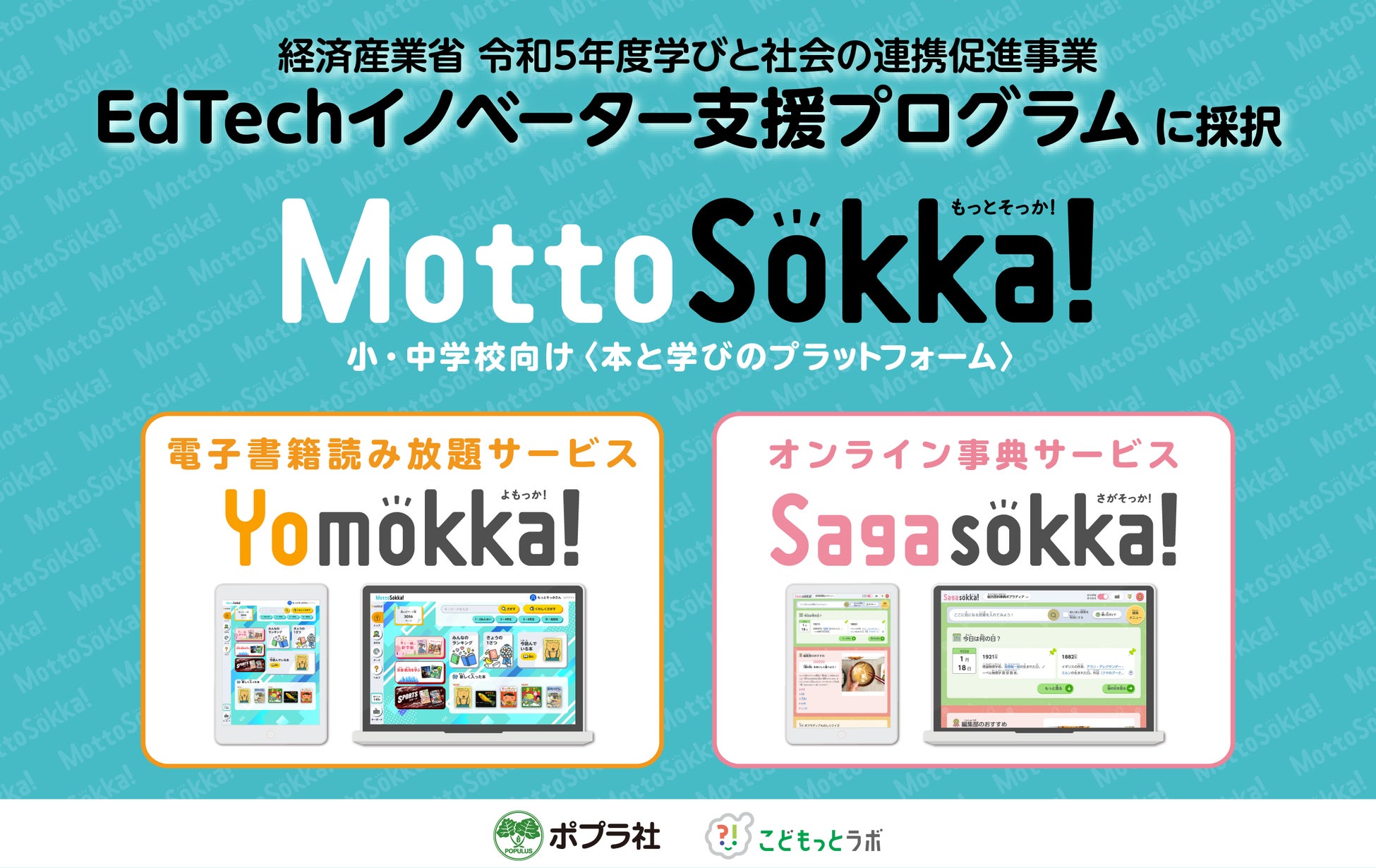 小・中学校向けの教育ICTプラットフォーム『MottoSokka!(もっとそっか!)』を通じて電子書籍読み放題サービス『Yomokka!(よもっか!)』とオンライン事典サービス『Sagasokka!(さがそっか!)』を提供している株式会社ポプラ社が、経済産業省の実施する「令和5年度学びと社会の連携促進事業(教育/EdTechイノベーション創出支援事業)」の一環である「EdTechイノベーター支援プログラム(Edvation Open Lab:EOL)」に採択されました。