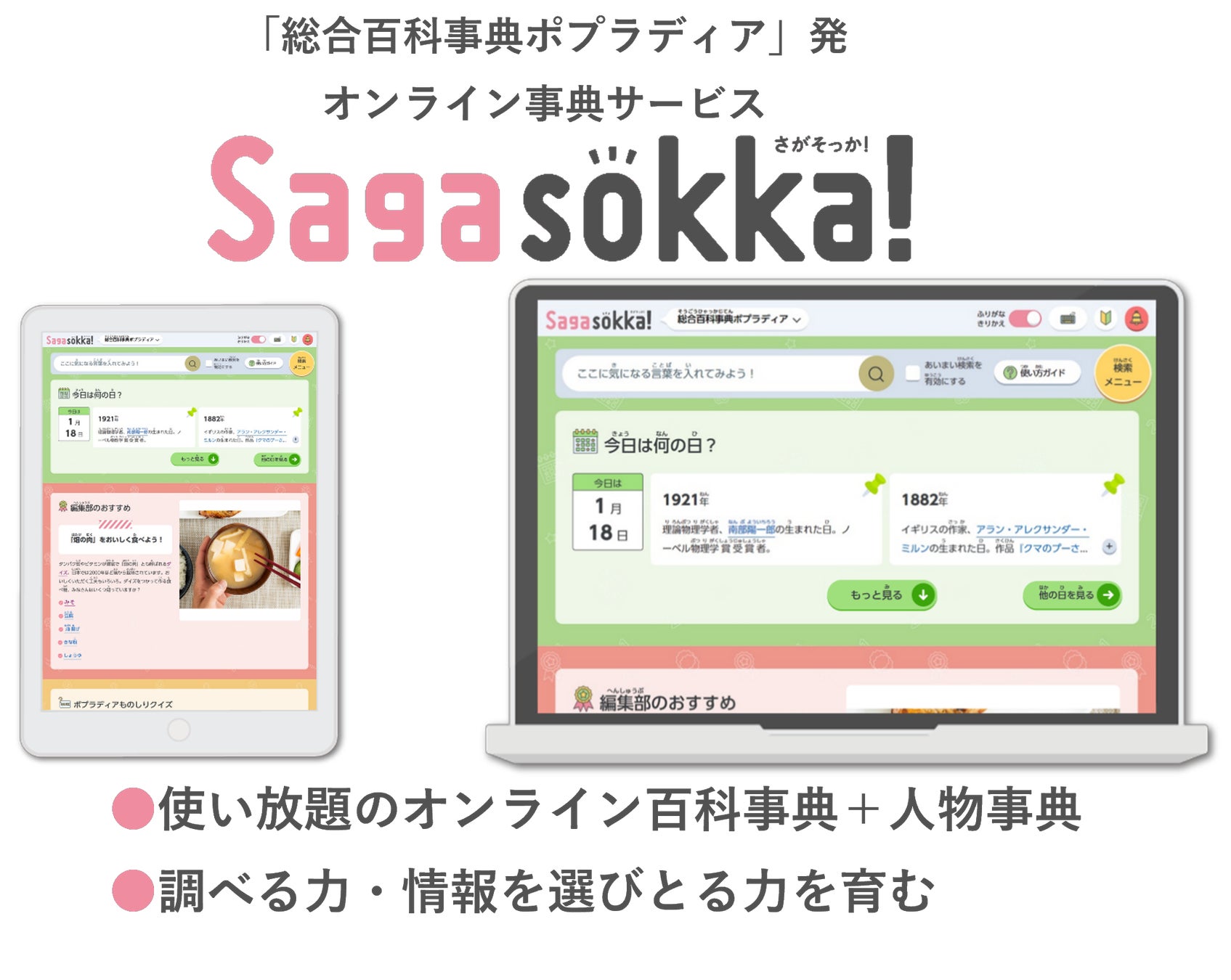 『Sagasokka!』は「総合百科事典ポプラディア」を中心にこども向け百科事典・人物事典コンテンツをデジタル化した、探究学習応援サービスです。インターネット上の情報収集の入り口として、情報活用能力を育みます。