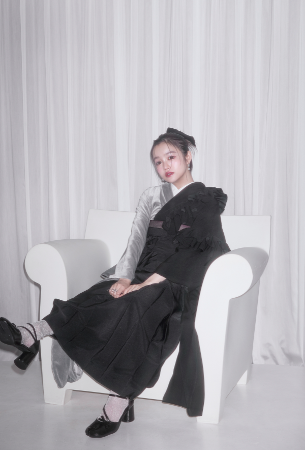 ブラックでまとめた中にグレーのベロアとシルバーのソックス、ワインレッドの帯がアクセントとなるコーデに。
