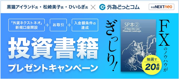 株式会社外為どっとコム(本社:東京都港区、代表取締役社長:竹内 淳)は、店頭FX『外貨ネクストネオ』会員様限定で、抽選で20名様に投資書籍が当たるキャンペーンを2025年3月3日(月)より実施します。