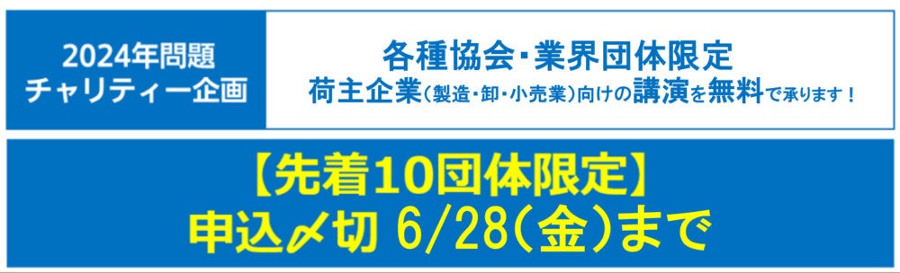 【先着10団体】2024年問題 チャリティー企画!荷主企業(製造・卸・小売業向け)向けの講演を"無料"で承ります|物流コンサルの船井総研ロジ