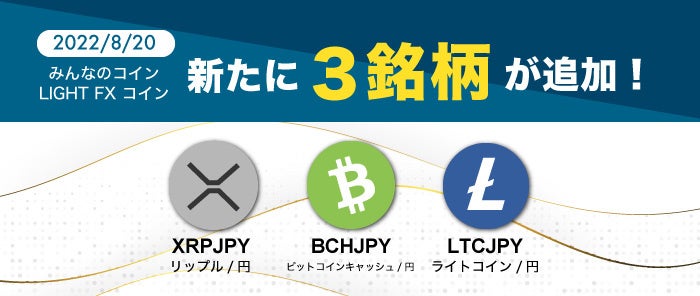 トレイダーズホールディングス株式会社(東京証券取引所スタンダード市場8704)の子会社で、外国為替証拠金取引事業(FX取引)等を営むトレイダーズ証券株式会社(本社:東京都港区、代表取締役:須山 剛、以下「トレイダーズ証券」)は、2022年8月20日(土)に暗号資産取引サービス「みんなのコイン」および「LIGHT FX コイン」において、新たにリップル(XRP)、ライトコイン(LTC)、ビットコインキャッシュ(BCH)の取り扱いを新規に開始いたしました。従来のビットコイン(BTC)、イーサリアム(ETH)に加え、今回の3種の暗号資産銘柄を追加することで、「みんなのコイン」「LIGHT FXコイン」のラインアップが5種類となります。