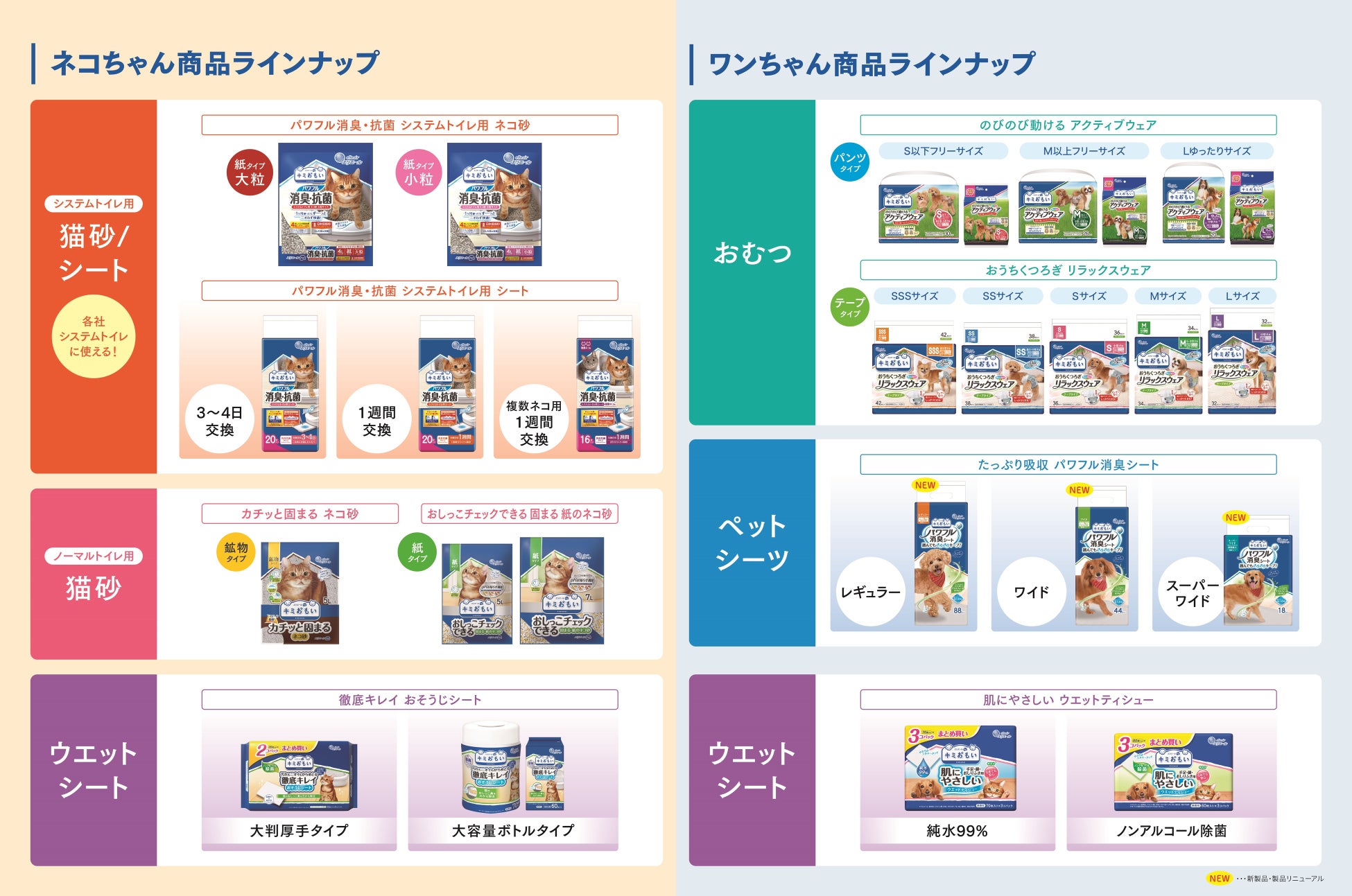 「エリエールPet キミおもい」は、ペットとオーナーさんの“より幸せな暮らし”をカタチにするため、“ペットへのやさしさ”と“多様化するペットオーナーさんのニーズ”を重視した5カテゴリー(システムトイレ用猫砂・シート、ノーマルトイレ用猫砂、おむつ、ペットシーツ、ウエットシート)の商品を展開。