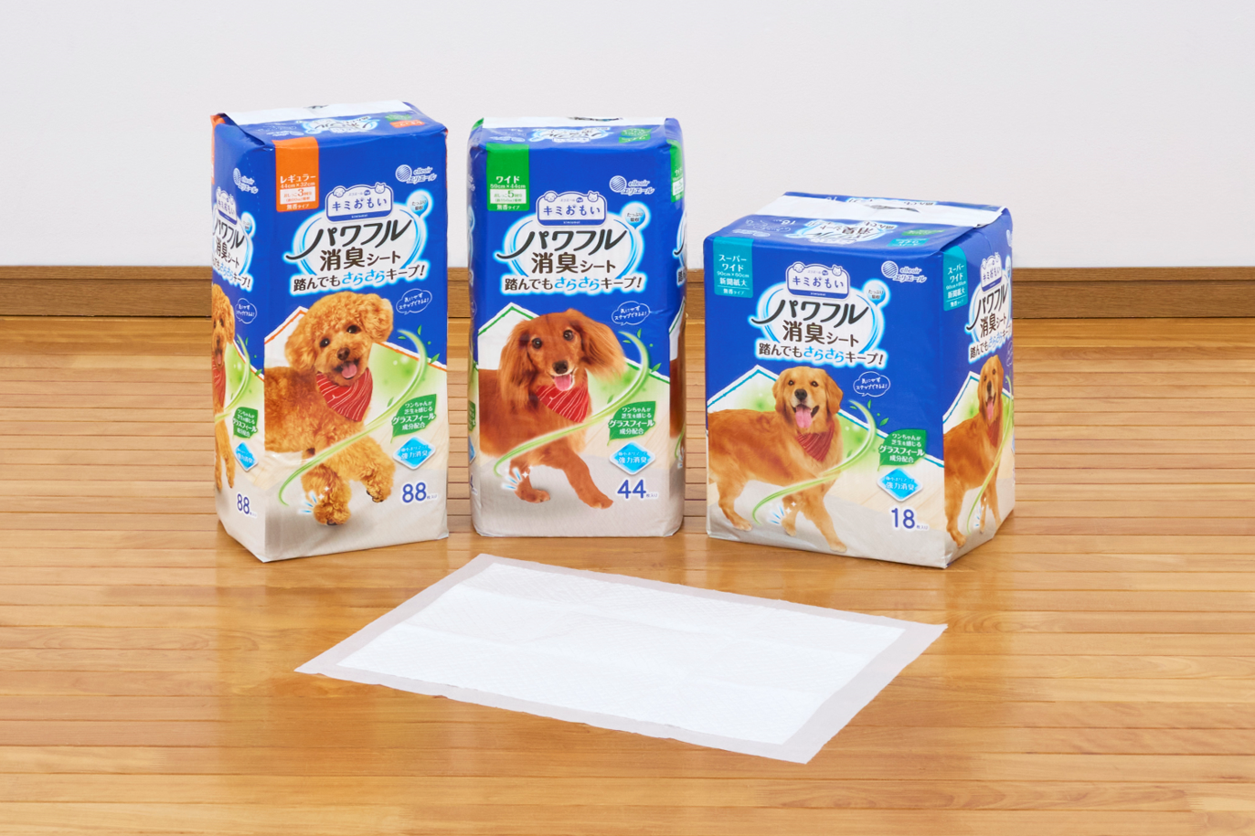 そこで当社は、2023年9月の発売以来好評いただいている『エリエールPet キミおもい たっぷり吸収 パワフル消臭シート』をさらに進化させ、従来の逆戻りしにくい構造はそのままに、吸水性能を強化。おしっこの拡散面積が小さくなり、排尿中の足濡れも軽減し、ワンちゃんやオーナーさんが、より快適に過ごせるように設計しました。