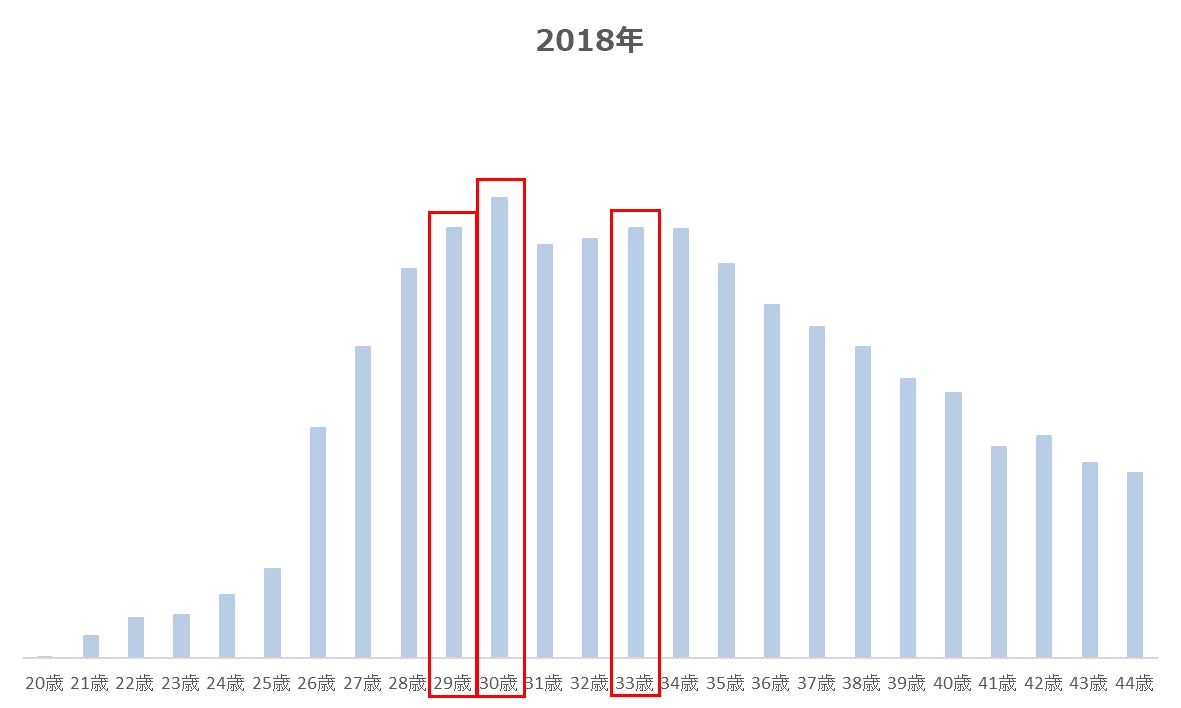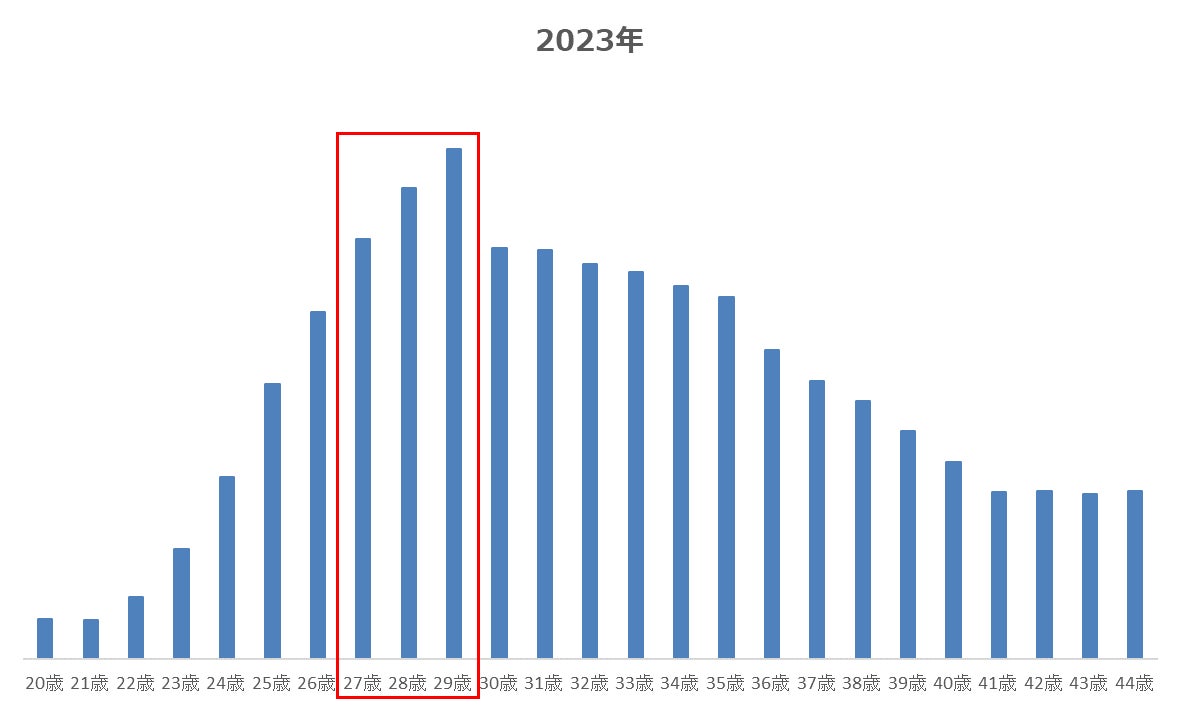 まずは、問い合わせにおける年代についてです。2018年の問い合わせは30歳がもっとも多く、次いで33歳、29歳と続いています。しかし、2023年においては29歳がもっとも多く、次いで28歳、27歳と続いています。