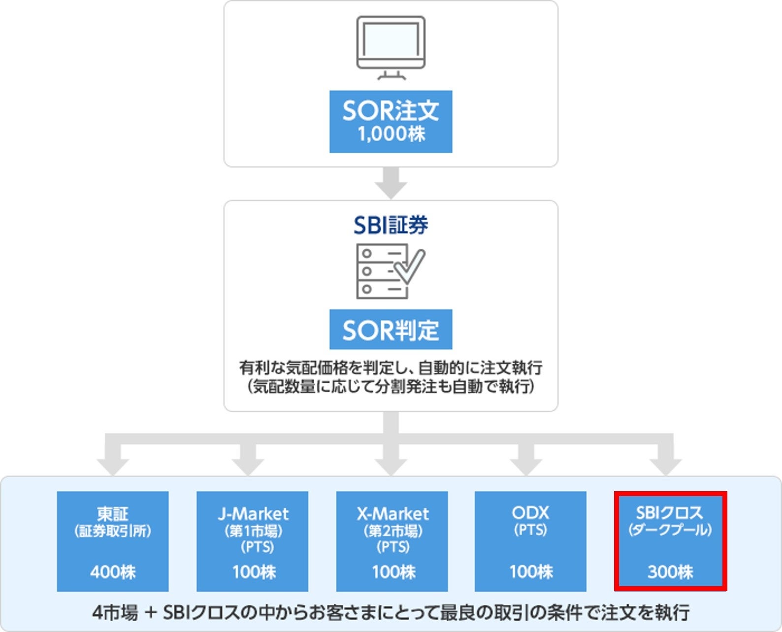 「SOR(スマート・オーダー・ルーティング)注文」とは、複数市場から最良の気配価格を提示している市場を選択して注文を執行する形態の注文です。当社の「SOR注文」は、「SBIクロス(ダークプール)」、「証券取引所(当社優先市場)」、ジャパンネクストPTSの 「J-Market(第1市場)」および「X-Market(第2市場)」、「大阪デジタルエクスチェンジPTS」の5市場等で提示されている気配価格等を監視し、最良価格(同値を含む)を提示する市場等を判定して、自動的に注文を執行します。このたびの「SBIクロス」の追加によりSORの判定先が増え、より有利な価格での約定機会が増加し、価格改善効果の向上が期待できます。