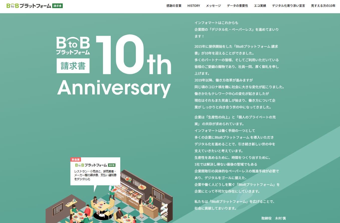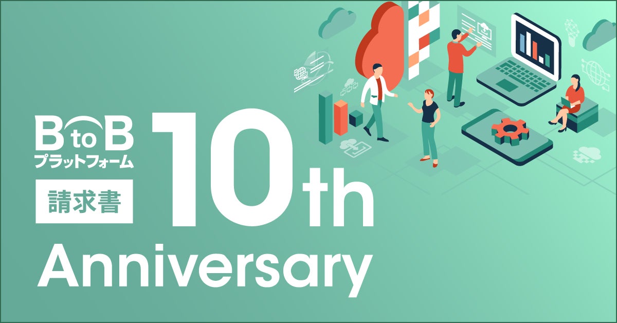 「BtoBプラットフォーム 請求書」はサービス提供10周年を迎えました。これもひとえに、ご利用いただいているお客様、パートナー企業の皆様等、多くのご支援の賜物であり、心より感謝申し上げます。