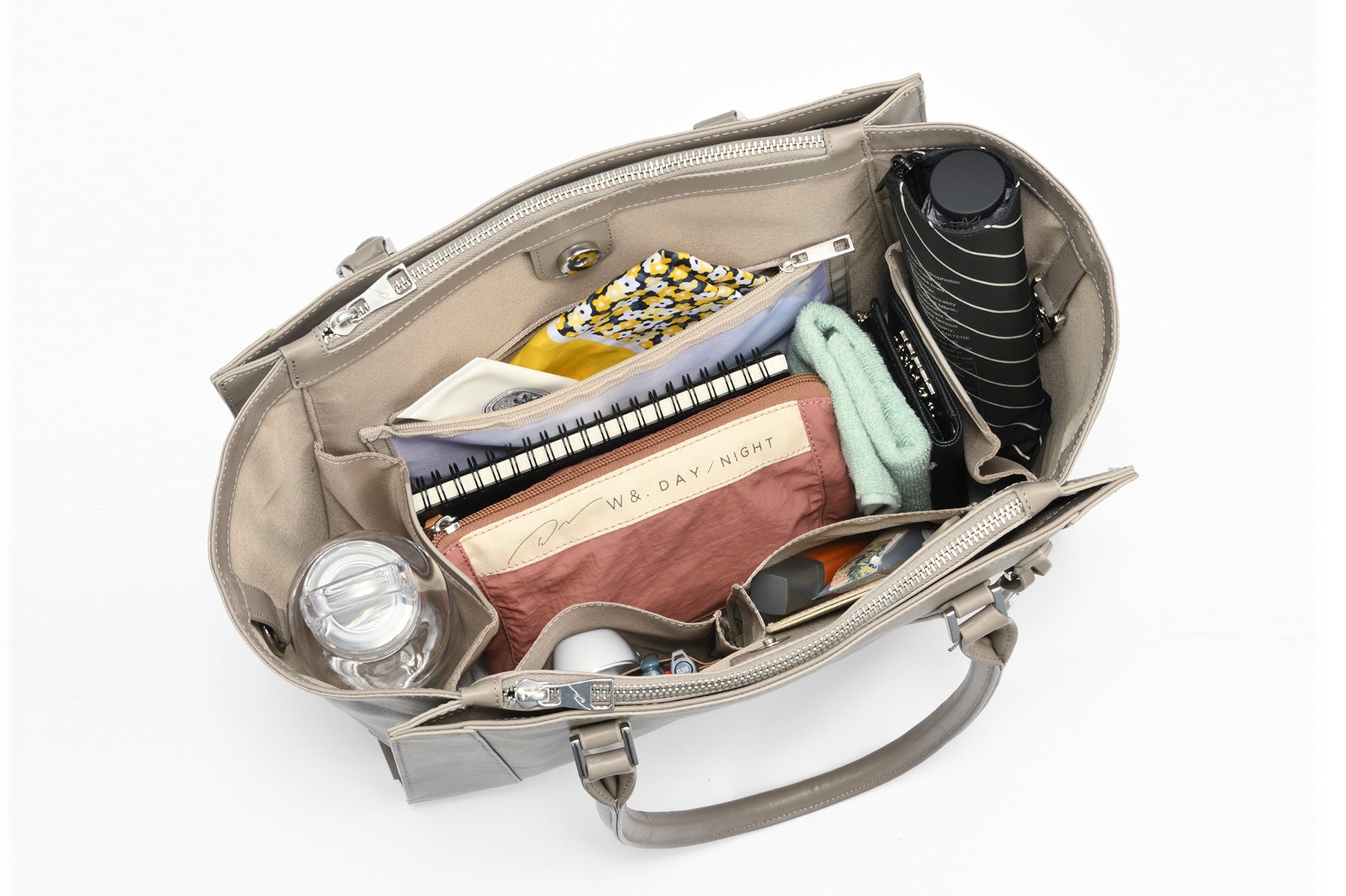 本体の360度全方位に設けられた収納ポケットは、忙しい朝でも鍵やパスケースなどの小物をすぐに取り出せるストレスフリーな使い心地を実現しています。さらに、13.3インチ対応のPCケースが付属しており、ビジネスツールの持ち運びも安心です。