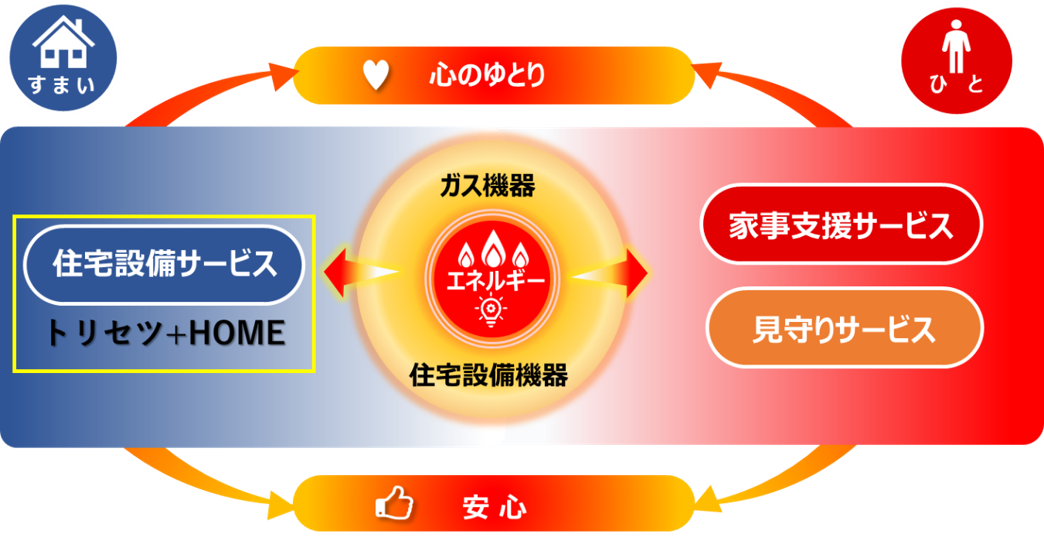 東京ガスグループは、「ひと」と「すまい」を対象に、①住宅設備、②家事支援、③見守りを重点的に取り組むサービスと定め、お客さまに「安心」と「心のゆとり」をご提供できるサービス展開・開発を目指します。