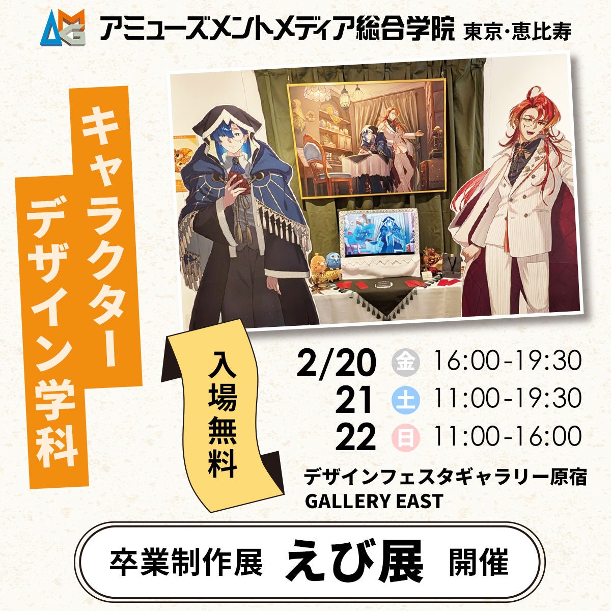 エンタメ業界のプロを育成するアミューズメントメディア総合学院(東京都渋谷区/理事長:吉田 東吾、以下 AMG)は、キャラクターデザイン学科による卒業制作展「AMG キャラクターデザイン学科 第20回卒業制作展『えび展』」を、2026年2月20日(金)から22日(日)までの3日間、デザインフェスタギャラリー原宿にて開催いたします。入場は無料・予約不要です。(※入学者見学会は要予約)