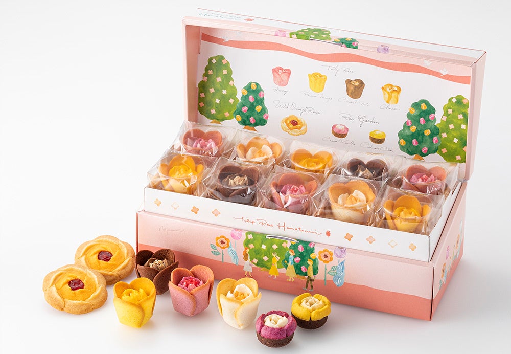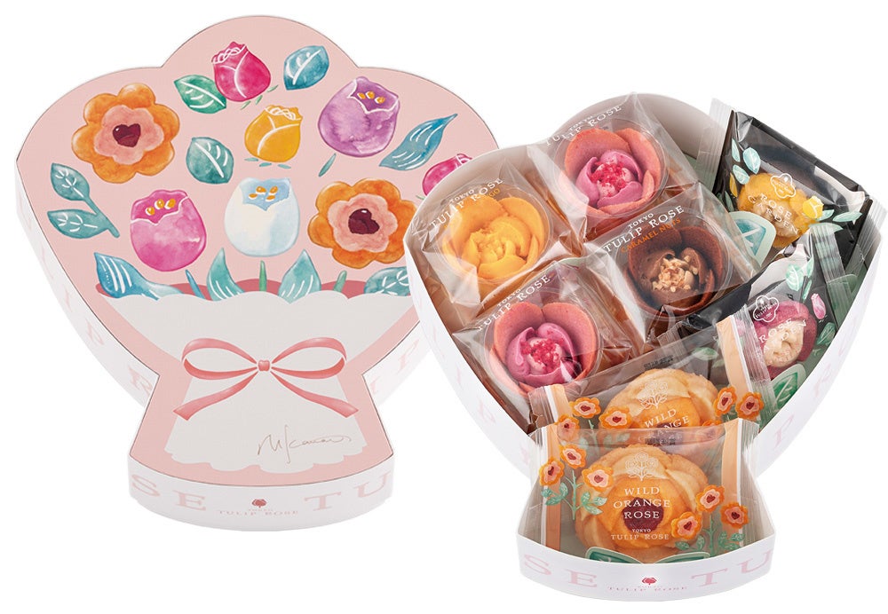 お花のスイーツがあふれだす2段重ねの豪華なボックスは、お花が咲きほこった春のチューリップタウンの街角を行き交う人々を描いた限定デザイン。こうばしい香りあふれる季節限定「チューリップローズ チーズ」をはじめ、7種のお花が楽しめる詰合せで登場します。ぽかぽか陽気でたのしむパーティーや、大好きなお母さんへ笑顔を届けるサプライズギフトに!