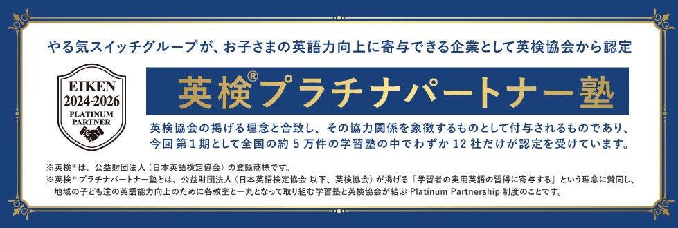 ※公益財団法人 日本英語検定協会(以下、英検協会)が掲げる「学習者の実用英語の習得に寄与する」という理念に賛同し、子ども達の英語能力向上のために各教室と一丸となって取り組む教育サービス提供社と英検協会が結ぶ Platinum Partnership 制度のことです。