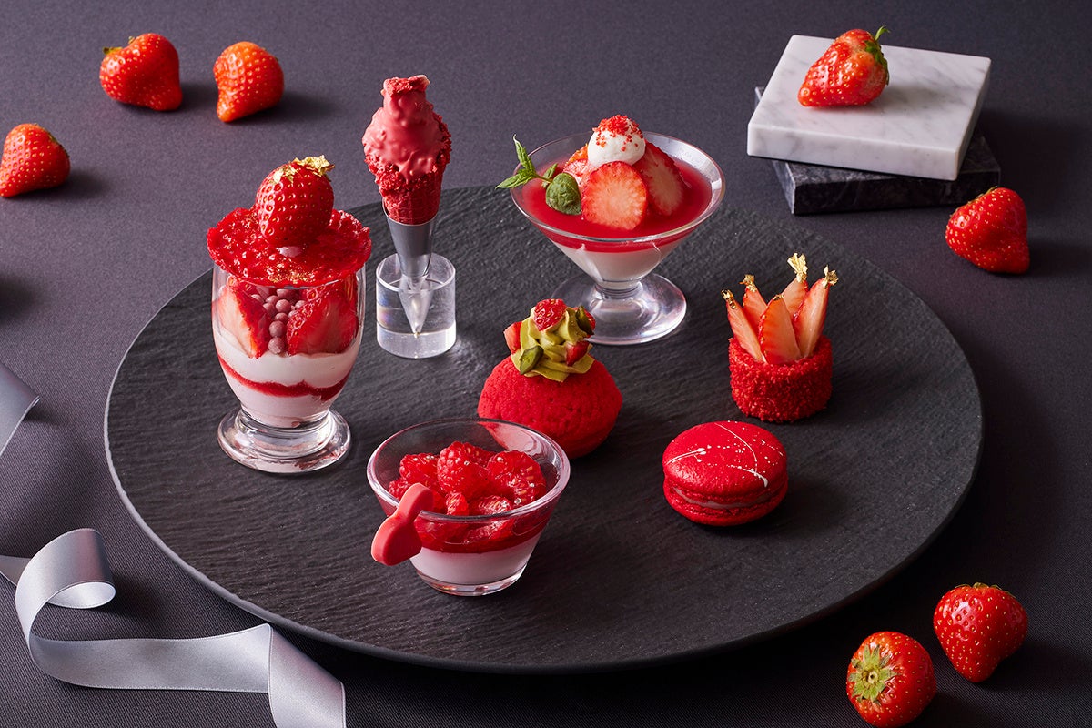 深みのある赤が印象的なスイーツは、いちごを主役にした全7種類。ピスタチオやライム、ラズベリーなどいちごと相性の良い素材を組み合わせることで、甘さだけでなく爽やかな酸味や香ばしさも感じられる大人のいちごスイーツに仕上げました。パフェやタルトからなめらかなパンナコッタ、スープ仕立ての一品にマカロンなど、多彩なスタイルでいちごの魅力をご堪能ください。
