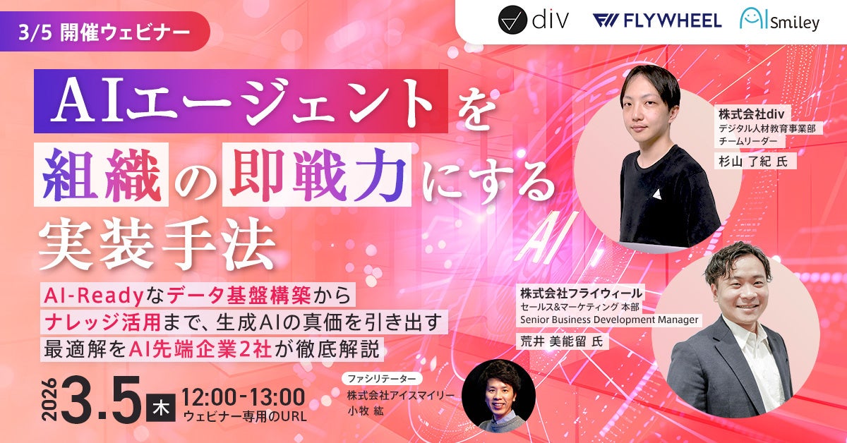 国内最大級のAIポータルメディア「AIsmiley」を運営する株式会社アイスマイリー(東京都渋谷区、代表取締役:板羽晃司)は、2025年3月5日(木)12時からAIエージェントウェビナーを開催します。