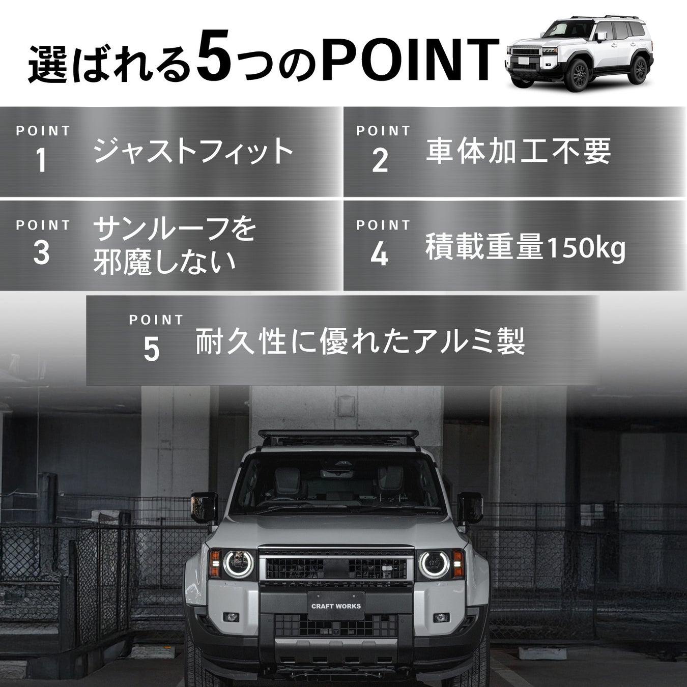 【予約販売】ランクル250専用スクエアフラットルーフキャリア登場。最大積載150kg。ボディスタイルを崩さないフラットなデザイン。機能性とデザイン性を兼ね備えた、洗練されたスタイルのルーフキャリア。