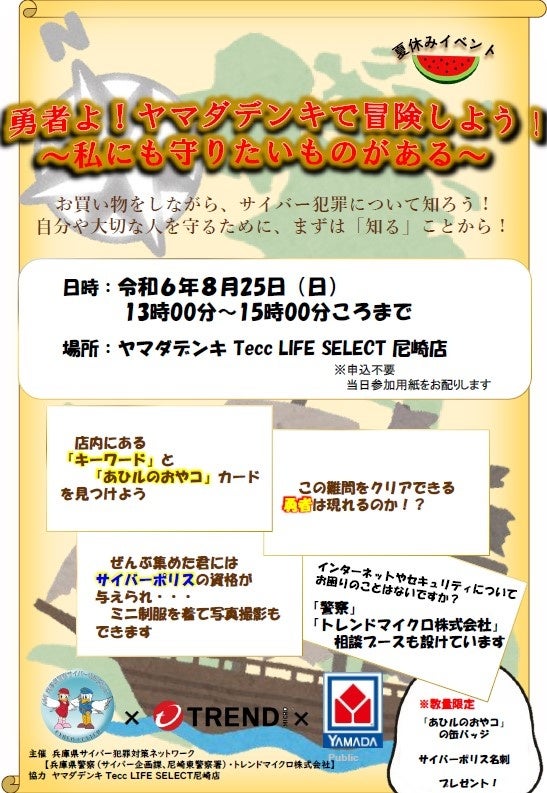 株式会社ヤマダホールディングス(本社:群馬県高崎市、代表取締役会長 兼 社長 CEO:山田 昇、以下、ヤマダホールディングス)は、兵庫県サイバー犯罪対策ネットワーク(事務局:兵庫県警察サイバー企画課)によるサイバー犯罪の被害防止に向けた取り組みに賛同し、2024年8月25日(日)にグループ企業である株式会社ヤマダデンキ「Tecc LIFE SELECT 尼崎店」において、「サイバー犯罪防止イベント」を開催いたします。
