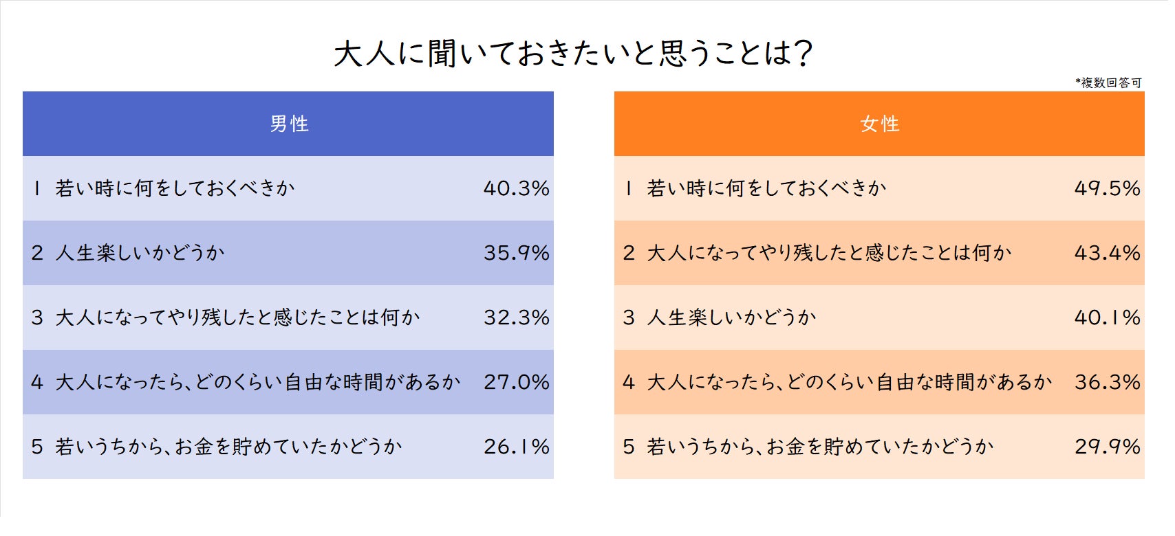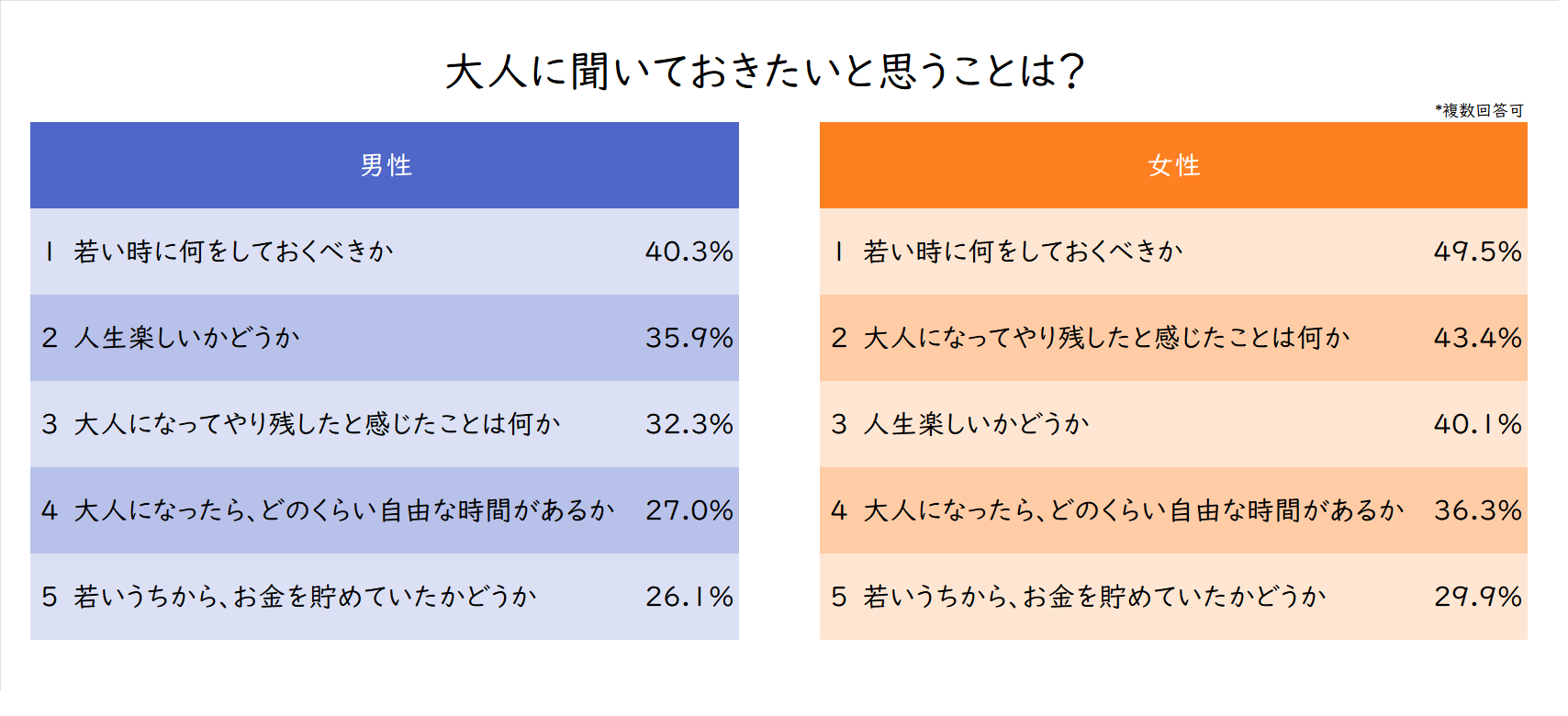 大人に聞いてみたいと思うことについて聞いたところ、男女ともに1位は「若い時に何をしておくべきか」となりました。以降、男性の2位は「人生楽しいかどうか」が35.9%、3位は「大人になってやり残したと感じたことは何か」32.3%となり、女性の2位は「大人になってやり残したと感じたことは何か」45.4%、3位が「人生楽しいかどうか」40.7%という結果になりました。