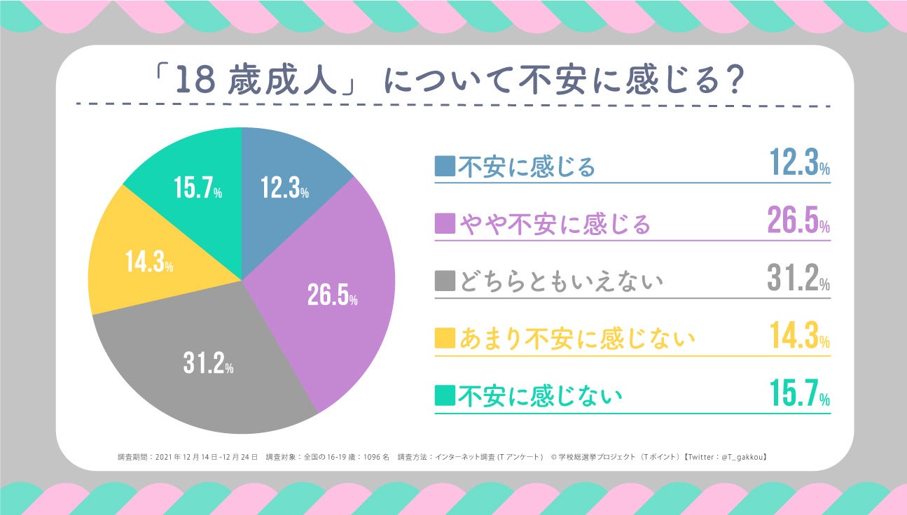 成人年齢が引き下がることで不安を感じるかを聞いたところ、「不安に感じる」が12.3%、「やや不安に感じる」26.5%、「どちらともいえない」が31.2%、「あまり不安に感じない」が14.3%、「不安に感じない」が15.7%と、どちらかといえば不安を感じるプレ成人が多いことが分かりました。