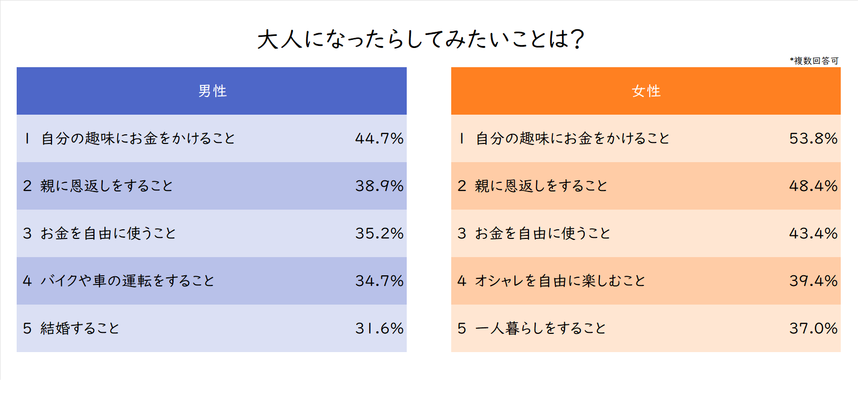 続いて、成人になったらしてみたいことについて、複数選択で聞いたところ、上位3位は男女ともに「自分の趣味にお金をかけること」、「親に恩返しをすること」、「お金を自由に使うこと」、という回答が寄せられました。