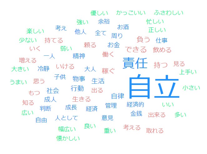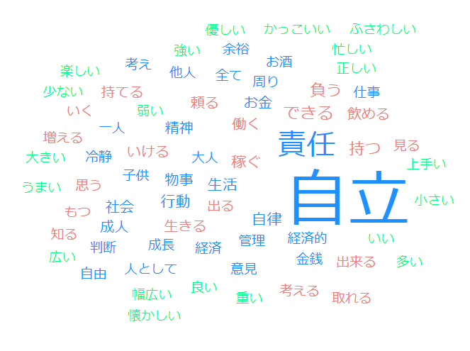 また、「大人になるとはどういうことか」について自由記述で回答いただき、その結果を分析したところ、頻出する単語として「自立」「責任」「できる」「生活」「稼ぐ」が多く挙がり、経済的にも自立できていることや、自らの行動や判断に責任を持つことを「大人になること」と考えている様子が伺えました。このことも不安を感じる背景にあるのかもしれません。