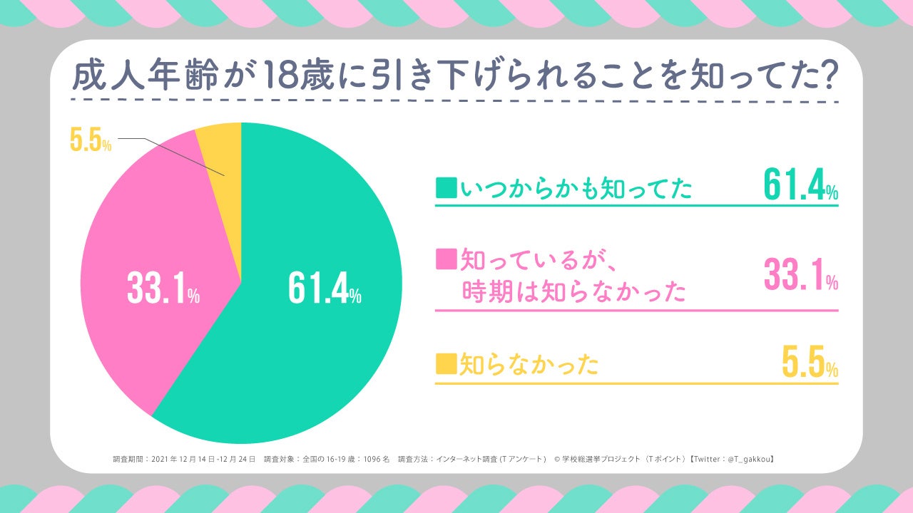 このたび「学校総選挙プロジェクト」では、2022年4月1日より成人年齢が18歳に引き下げられることを受け、2021年12月14日(火)~12月23日(木)までの間、オンライン調査によって“18歳成人”についての調査を行い、これから成人を迎える全国の16歳から19歳の「プレ成人」1096名より回答をいただきました。