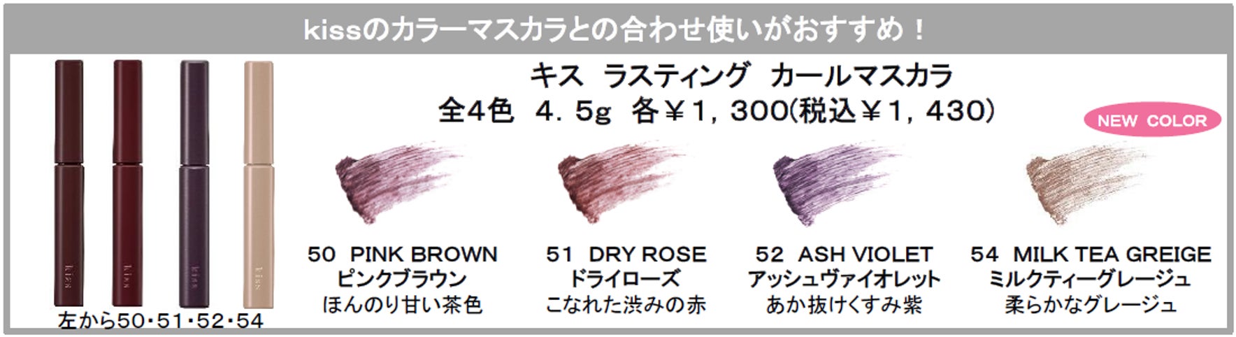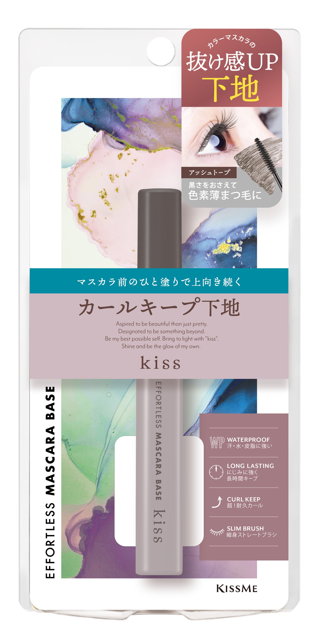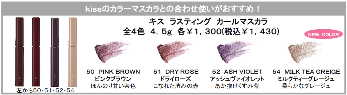 “kiss”から自まつ毛の黒さを抑えて、上に重ねるカラーマスカラの発色と抜け感をアップするカールキープマスカラ下地が新登場します。