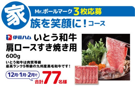 ご応募いただいた方の中から抽選で、「いとう和牛肩ロースすき焼き用600g」や「ソムリエの田崎真也さんセレクトの直筆サイン入り赤ワイン」、「JCBギフトカード3,000円分」がそれぞれ77名様に当たります。