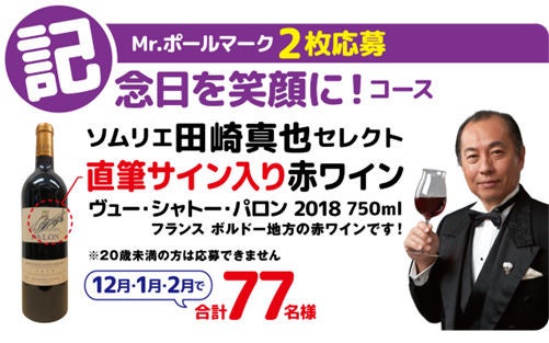 対象商品の裏面に印刷された「Mr.ポールマーク※」を切り取り、専用応募ハガキまたは郵便ハガキにご希望のコースに必要な枚数分を貼り付け、郵便番号、住所、氏名、年齢、電話番号、ご希望のコースを明記の上、ご応募ください。お一人様何口でもご応募いただけますが、ハガキ1枚につき1口とさせていただきます。