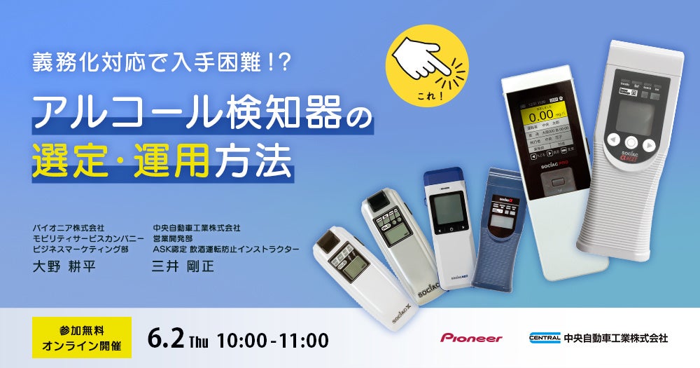 パイオニアは、中央自動車工業株式会社(代表取締役社長 坂田 信一郎、以下「中央自動車工業」)と、企業経営者や車両管理担当者、安全運転管理担当者などを対象としたウェビナー「義務化対応で入手困難!?アルコール検知器の選定・運用方法」を、6月2日(木)に開催します。