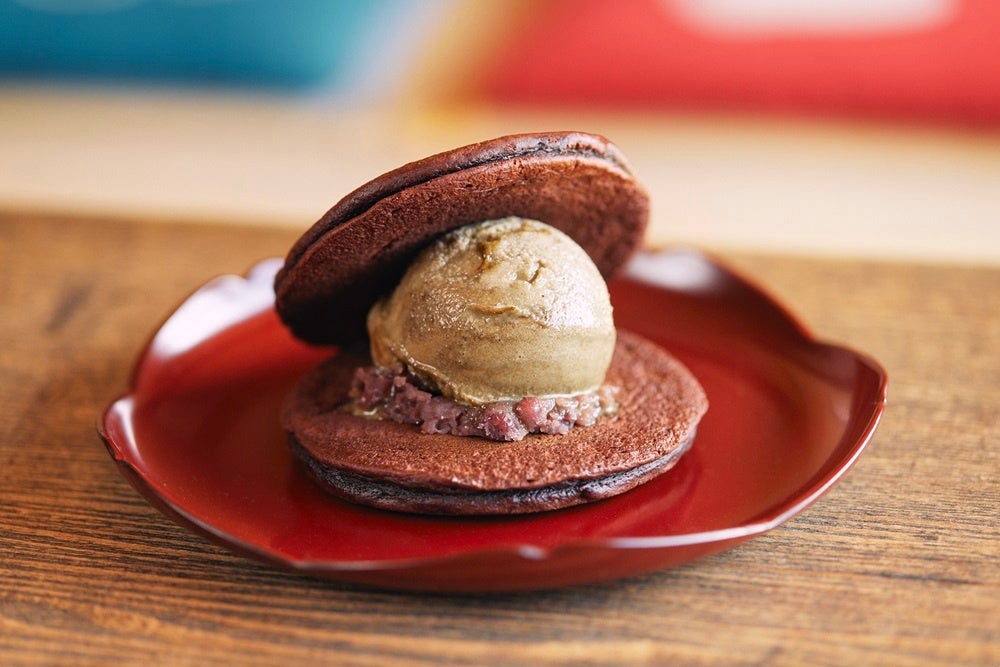 職人が一枚ごと丁寧に手焼きするどら焼き生地にイタリア製の高品質カカオ原料を配合、ご当地食材を使ったお好きなアイスクリームと能登大納言粒餡をサンドした人気メニュー。
