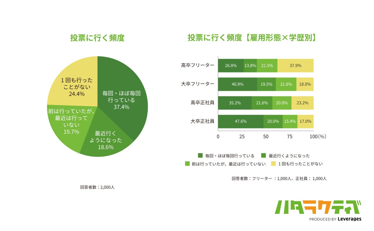 また、高卒正社員よりも大卒フリーターのほうが選挙に行く割合は多く、雇用形態よりも学歴による差のほうが選挙参加に影響を与える傾向があることが見受けられます。投票率の改善に学歴別にアプローチすることは、一つの手段となりそうです。