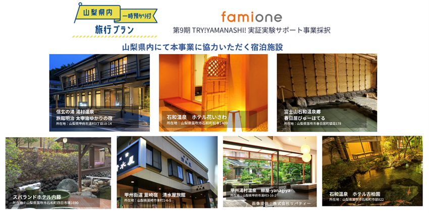 「子どもを願うすべての人によりそい 幸せな人生を歩める社会をつくる」をビジョンに掲げ、法人の従業員向け福利厚生や自治体の住民向け支援を行うヘルスケアサポートサービス「ファミワン」 https://famione.com/benefit/などを展開する株式会社ファミワン(本社:東京都渋谷区、代表取締役:石川勇介)は、山梨県(知事:長崎幸太郎)が実施する、山梨県全域を対象にした実証実験を全面的にサポートする「第9期TRY!YAMANASHI!実証実験サポート事業」に採択されています。